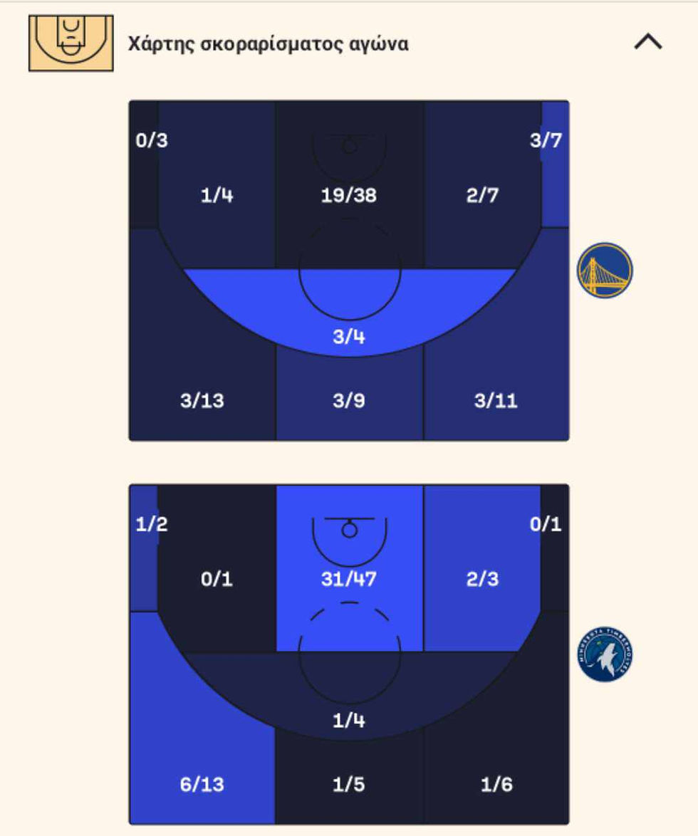 To shot chart απεικονίζει πως αν και οι Warriors επιχείρησαν 3 τρίποντα παραπάνω από τον μέσο όρο τους (συνολικά 43), η αποτελεσματική άμυνα των Timberwolves, τους ανάγκασε να ηττηθούν με το...φτωχό 23% από την γραμμή των 6.75