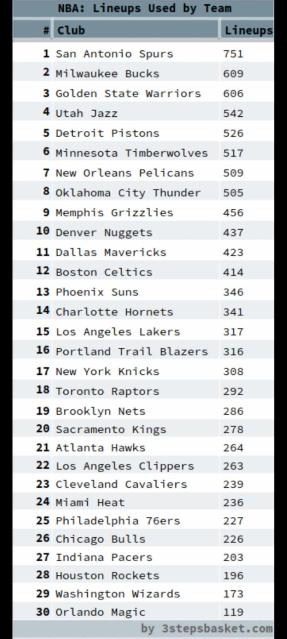 Όχι, η ομάδα του Finch δεν τα κάνει όλα τέλεια. Υστερεί σημαντικά στην άλλη πλευρά του παρκέ. Είναι 15η στην λίστα του offensive rating και κάνει περίπου 14 λάθη σε κάθε της αναμέτρηση. Αυτό, ίσως δίνει μια εξήγηση στην παρακάτω εικόνα, αφού οι «Wolves» ακόμα... ψάχνουν την ιδανική (επιθετικά) πεντάδα.