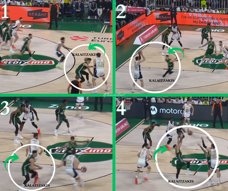 Δεν μπόρεσε να ολοκληρώσει ο ίδιος το κλέψιμο αλλά ο Κώστας που βρισκόταν από πίσω. Με γρήγορο transition, ο Καλαϊτζάκης - από ασίστ του Αντετοκούνμπο - τελείωσε την φάση με ένα άνετο layup. Αυτή η φάση υπήρξε η σπίθα για ένα σερί 6 - 0 των "πρασίνων".