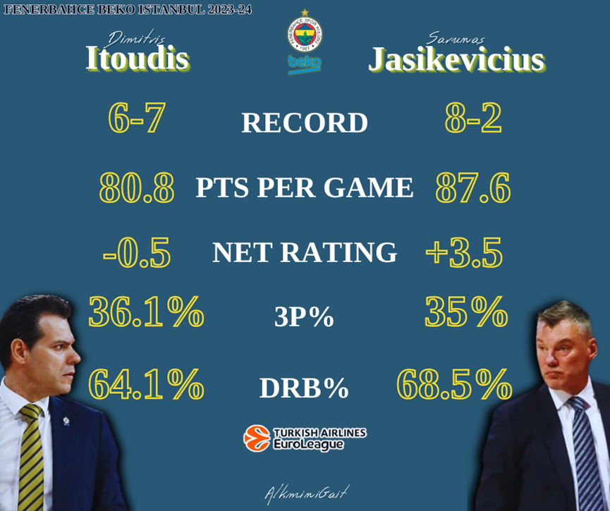 Υπό την ηγεσία του Jasikevicius, η Φενερμπαχτσέ έχει ρεκόρ 8-2, σημαντική και εμφανής βελτίωση σε σύγκριση με το αρνητικό ρεκόρ (6-7) που άφησε ο Ιτούδης πριν την αποχώρησή του. Η τουρκική ομάδα παρουσιάζει επιθετική βελτίωση με 87.6 πόντους ανά παιχνίδι έναντι 80.8 πόντων.
