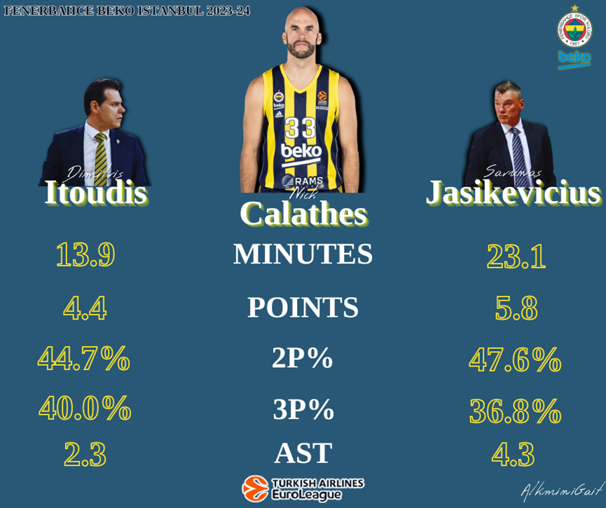 Σημαντική άνοδος για τον Calathes που με τον περισσότερο χρόνο συμμετοχής που λαμβάνει (23.1 λεπτά > 13.9 λεπτά), αύξησε τα νούμερά του. Οι πόντοι του από 4.4 ανά παιχνίδι έγιναν 5.8. Παράλληλα, βελτίωσε την αποτελεσματικότητά του στο δίποντο με ποσοστό 47.6% από το προηγούμενο 44.7%. Ανάλογη αύξηση και στις ασίστ που δημιουργεί (4.3 επί Saras έναντι 2.3 επί Ιτούδη).
